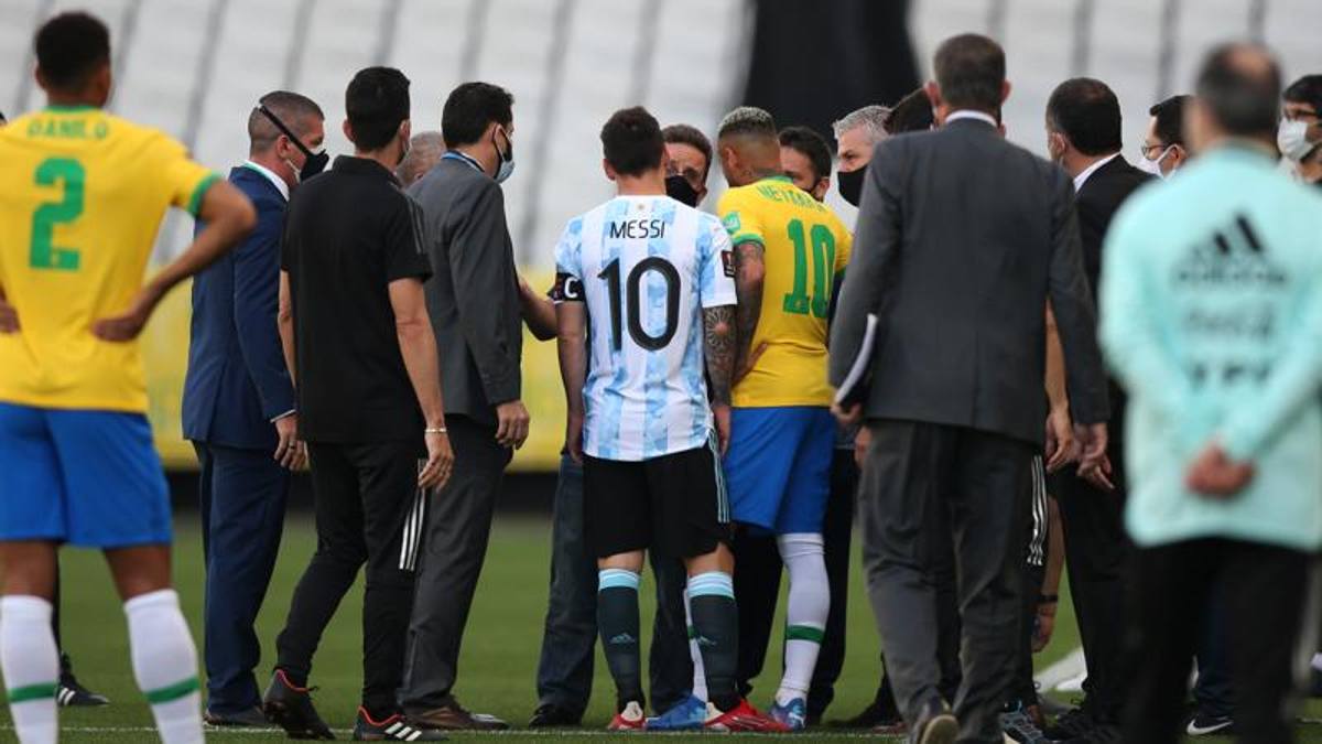 Shortly after the start of the World Cup qualifying match between Brazil and Argentina officials from the health authority stepped onto the pitch and caused the game to be abandoned. Brazil and Argentinas player talk as the soccer game is interrupted by. The South American Football Confederation CONMEBOL informed in a statement that the referee and match.